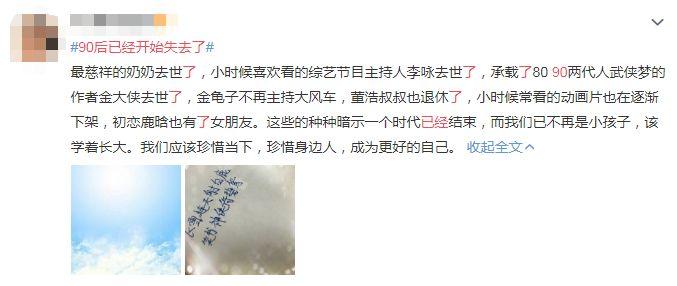 最慈祥的奶奶去世了,小时候喜欢看的综艺节目主持人李咏去世了,承载了80 90两代人武侠梦的作者金大侠去世了,金龟子不再主持大风车,董浩叔叔也退休了,小时候常看的动画片也在逐渐下架,初恋鹿晗也有了女朋友。这些的种种暗示一个时代已经结束,而我们已不再是小孩子,该学着长大。我们应该珍惜当下,珍惜身边人,成为更好的自己。