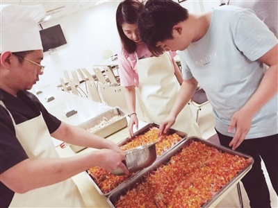 郝卓说,这种做法是他参考网上的做法,又加上自己的创意。“我在家做过,彩椒的清甜和虾肉的鲜嫩相搭配,鲜爽可口。这道菜还是蒸制的,也十分健康。”郝卓说,这道菜的关键是处理虾肉,“开背,挑虾线都是基本的。我的诀窍是,首先,虾肚子的壳儿要剪一点隔一段再剪一点,但不能断,入味好剥,虾的形状还要保持。虾肉要浸到汁水,防止虾肉干。第二,虾头里的东西都要洗掉,但是要保留虾头。要是油焖大虾就得保留全部虾头的内容。但是蒸制的话,虾脑就有点腥了。”将洗好的虾用盐、胡椒粉、料酒腌渍半个小时。把热油、蒜肉、调料处理过的彩椒碎铺在虾上面。“彩椒内有很多汁液,汁液会慢慢流到虾肉里。蒸制的时候,要掌握火候,蒸老了,虾就发干。蒸不熟,菜也不好吃。”
