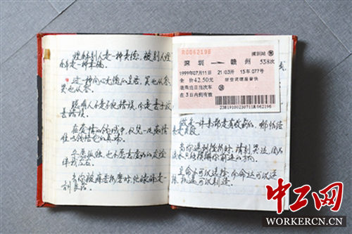 劳务工博物馆内陈列的笔记本,留存着务工者当年的“心灵鸡汤”和火车票。