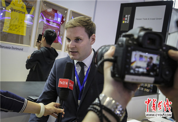 11月6日上午,首届进博会德国馆,德国青年联盟国际委员会委员亚尼克·伯里接受中国青年报·中青在线记者采访。中国青年报·中青在线记者 李峥苨/摄
