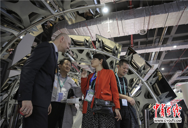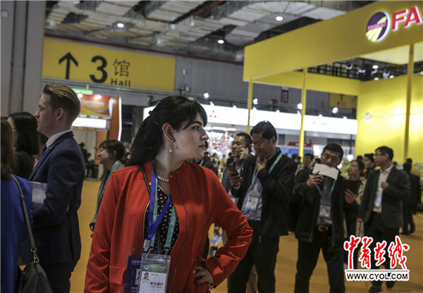 11月6日上午,首届进博会智能及高端设备馆,丝绸之路国际青年联盟秘书长阿伊旦·阿丽耶娃参观德国光伏企业AVANCIS展出的一台大型设备。中青在线记者 李峥苨/摄