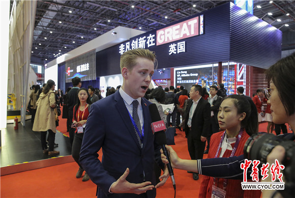 11月6日上午,首届进博会英国馆前,英国保守党青年事务负责人格雷格·史密斯接受中国青年报·中青在线记者采访。 中国青年报·中青在线记者 李峥苨/摄
