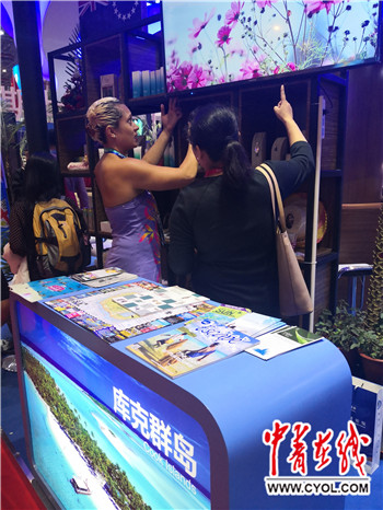 库克群岛旅游部高级助理卡莲娜·玛濮女士盛装打扮,向来自旅行社的客商介绍库克群岛旅游线路。王烨捷/摄