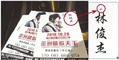 在“亚洲情歌天王歌迷见面会平江站”活动的宣传传单中,“小林俊杰”的“小”字几乎看不见 “小林俊杰”字样的局部放大