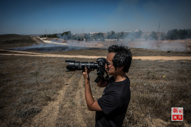 2014年7月29日,新华社耶路撒冷分社记者李睿在靠近加沙地带北部边境的以色列小镇代罗特附近34号公路旁。