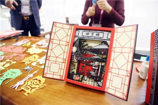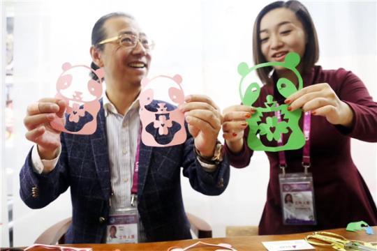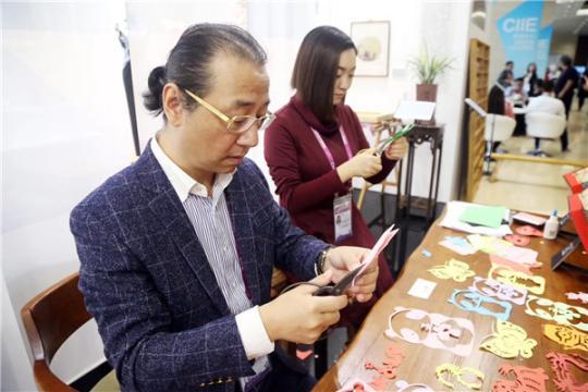 在进博会新闻中心内,同步举行的上海非物质文化遗产专题展吸引着各国来宾和媒体驻足流连。展厅内采用静态展品环抱互动体验区的格局,展示了15项富有上海特色的非物质文化遗产代表性项目,每天轮流驻场进行非遗制作和展示的传承人也成了全场的焦点。11月4日和5日,在展厅内打头阵的是一对父女档——海派剪纸艺术传承人李守白和他的女儿李诗忆,他们用熊猫进宝造型的剪纸征服了所有人的心。
