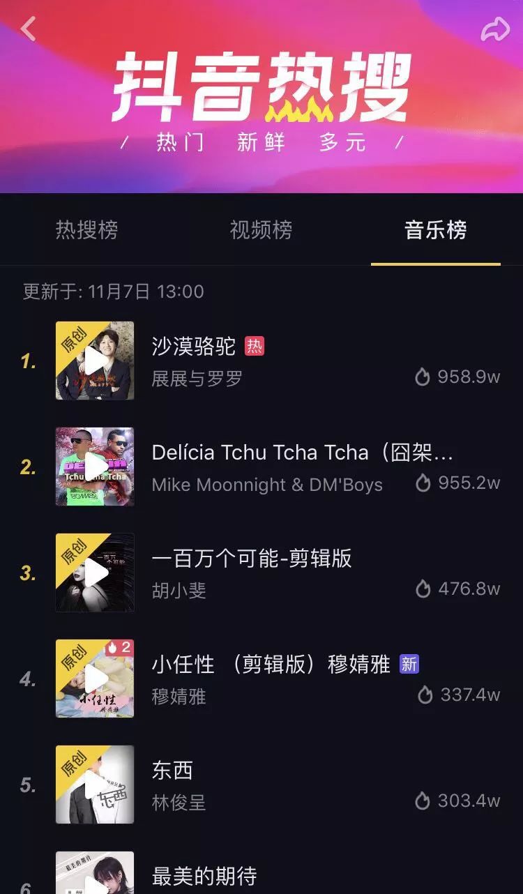 《沙漠骆驼》登上抖音音乐热搜榜首 图片来源:网络截图