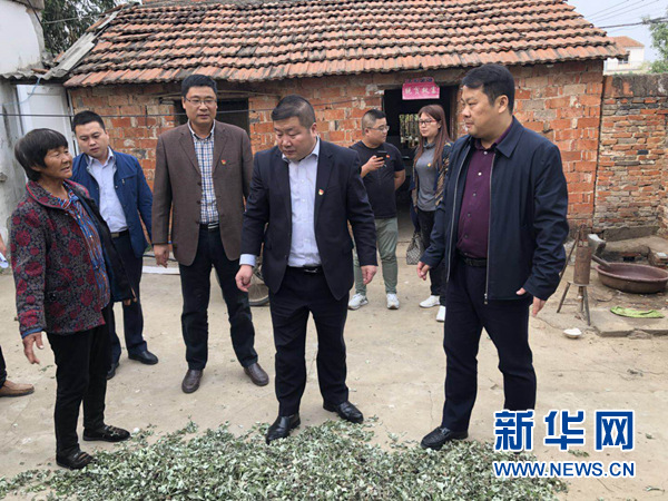 程建胜(右一)了解贫困户种植艾叶增收情况(资料照片)。新华社发
