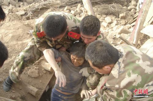 支队官兵齐心抬起石块解救灾民 武警玉树支队供图