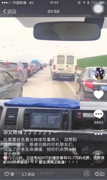 看到这一幕,护士余艺感动不已,忍不住拍下一段视频,发在了抖音上。她写道:“拉着警报急着出城接危重病人,没想到遇到了大堵车,感谢沿路的司机朋友们,让开了一条生命通道,给你们点赞。”