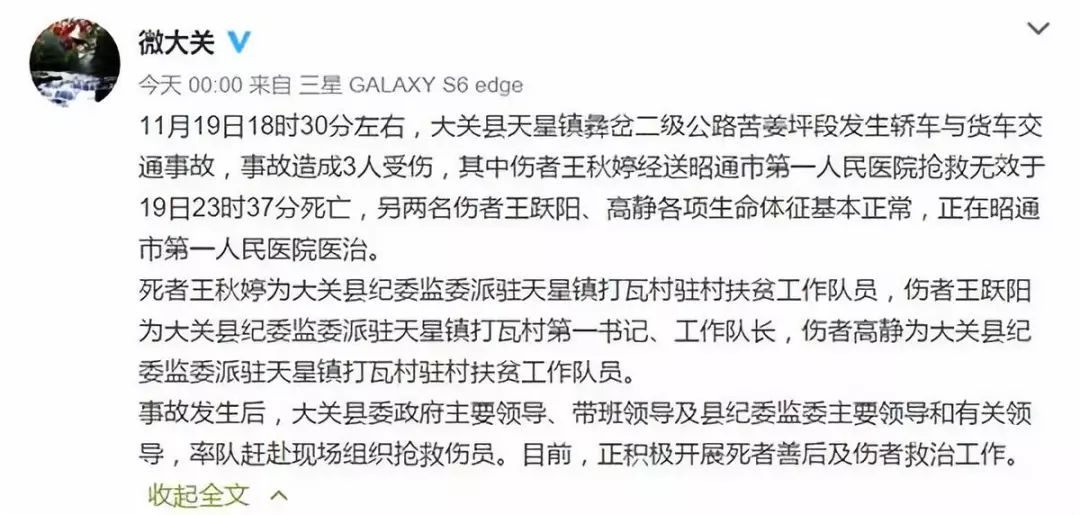 11月19日18时30分左右,云南昭通大关县3名扶贫干部在工作途中遭遇车祸,其中1人(女,26岁)不幸遇难,2人受伤。