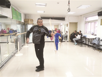 在教室里,记者看到有6个来学习棍法的孩子们正在上课。有的人手持一长棍练“二指花”——就是用两根手指将手中长棍翻转起来。“反背花”,就是将长棍在身后迅速翻转,有点像京剧中美猴王的棍法。还有人手持双棍与手持长棍的对手场景。现场棍棒相碰,铮铮作响,颇有观赏价值。