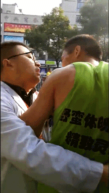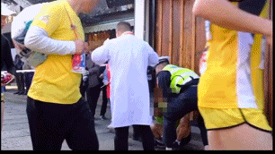 一位身穿绿色背心的跑者躺在地上,神志不清并伴随腿部抽搐,在经过医生的心肺复苏之后,站起来之后竟还想继续跑。现场的医生想阻拦并拉住这位选手,但似乎拽不住。