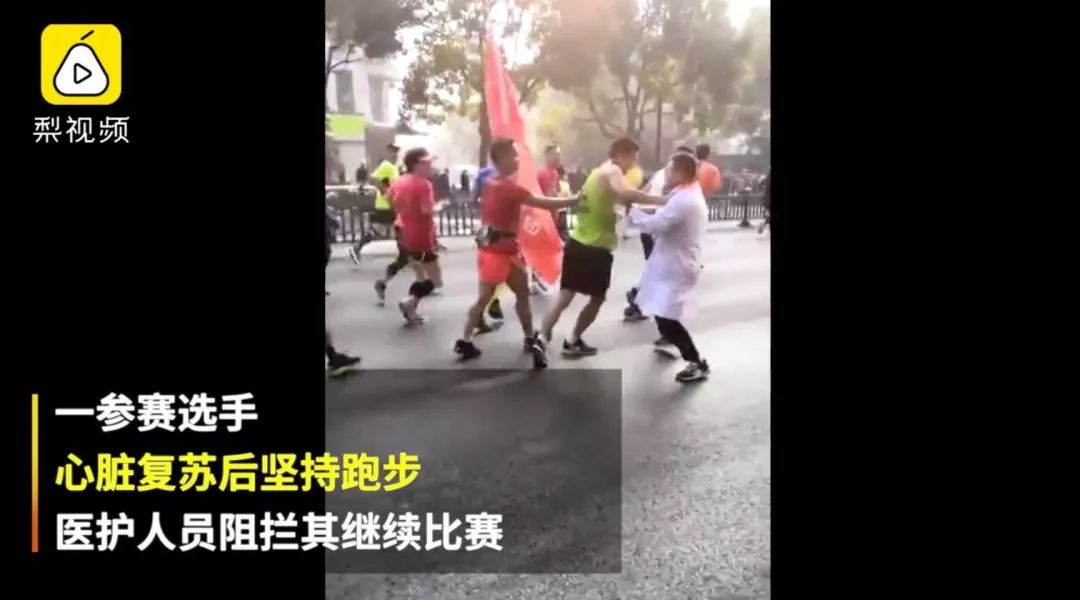 11月25日,在2018绍兴国际马拉松上发生惊魂一幕,一名选手晕倒接受心脏复苏后,醒来不顾医生和工作人员的劝阻,依然坚持比赛。