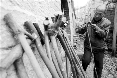 11月24日,河南鹤壁,位于太行山东麓浅山区的河南鹤壁淇滨区桑园村,年过六旬的张斗贵随着当地旅游扶贫小镇的开发,依靠自己从山上捡回的枯木手工制作成拐棍,卖给登山游客。不仅增收,还脱了贫,如今他综合年收入近万元。