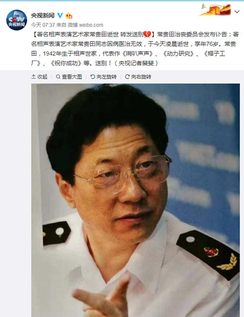 人民网北京11月30日电 (记者 吴亚雄)据央视新闻消息,常贵田治丧委员会发布讣告:著名相声表演艺术家常贵田同志因病医治无效,于今天凌晨逝世,享年76岁。