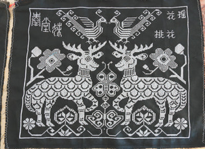 奉堂妹11岁起跟着母亲挑花。花瑶挑花中,行针的长短,用线的松紧,针脚的疏密等都是基本功,最特别也最困难的地方在于它没有描图画线或者模具绣架,一切全凭想象。“脑袋里要想好样子,想到什么样,就绣成什么样。”一个好的挑花人,需要有成熟的构图技巧和对美的理解。