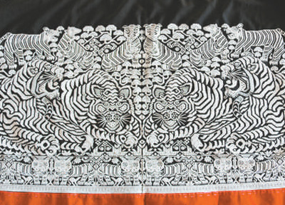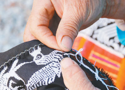 最能展现技巧的是筒裙的裙身。两块宽一尺七、长二尺三左右的布构成裙子的后片,约占整个裙身的3/4。在这样两块布上,动辄就能走上几十万针。细细的纱线在布面上来回往复,构成一个个“十”字或“一”字小图形,错落有致,疏密有间,最终形成一团团的花纹。
