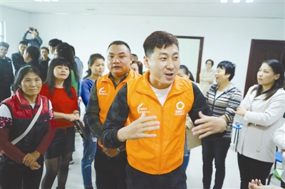 11月28日,在开展禁毒宣传活动时,王鑫(前黄马甲)通过“破冰”游戏活跃现场气氛。 记者 刘友婷 摄