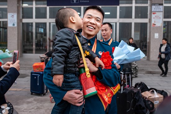 12月2日上午10点,一辆载着10多名老兵的列车缓缓驶入火车站站台,老兵们一下火车就感觉到一股股暖流。军地领导在车门口一一握手迎接,为他们披上“光荣退役、返乡荣光”的绶带,家乡少先队员捧上一束束鲜花献给老兵,并向他们敬礼。老兵家人们举着“老公,你最棒”“爸爸,您辛苦了,我们接您回家”的标识牌。