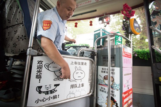 2018年9月2日,长春,226路公交车司机陈世利自费印刷了一些表情包提醒乘客。视觉中国供图