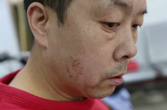 2018年3月8日,西安,102路公交车司机张师傅提醒酒后上车的3名乘客投币或刷卡,被辱骂殴打,右脸颊被咬伤。车队为其申请“委屈奖。视觉中国供图