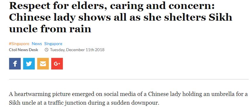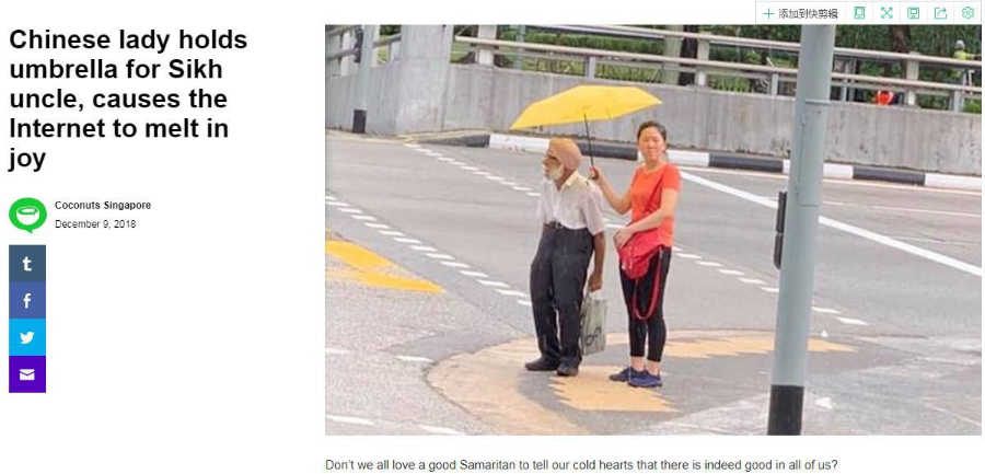 美国雅虎新闻网报道称,本月8日,在新加坡的一个交通路口处,一名中国女性和一名印度锡克教徒打扮的老者正在等红灯。彼时,天上突然下起了倾盆大雨,而这名老者并没有带伞。旁边的那名中国女性主动为老者撑起了伞,而她自己整个身子几乎都暴露在了大雨中。