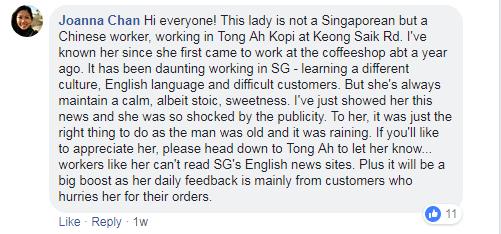 那么这名女子到底是谁呢?与她相识的网友“Joanna Chan”这样写道:“嗨,大家好!这名女士不是新加坡本地人,而是从中国来这儿工作的,她在恭锡路(Keong Saik Road )一家咖啡馆工作。大概一年前,她刚到咖啡馆工作的时候,我就认识她了。在新加坡工作真的是挑战很多,要适应一种新的文化、学习英语,有时还要应付难缠的顾客。但她总是很平静淡定隐忍,待人友善。我把这条新闻给她看了,她对大家对这件事的关注度感到很惊讶。对她来说,当看到一个老人淋着雨时,她肯定要那么做,她只是做了正确的事而已。”