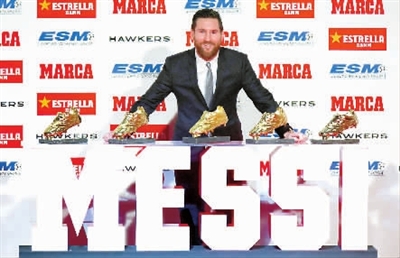 12月18日,梅西与他的五座欧洲金靴奖杯合影。当日,西甲巴塞罗那队球员梅西在西班牙巴塞罗那领取了2017-2018赛季欧洲金靴奖。这是他个人职业生涯第五次获得该奖项。