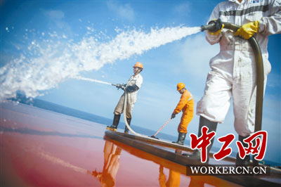 6月20日,渤海海域,金海发货轮上的水手们用高压水枪冲刷甲板。我国是世界海洋大国,但由于海上工作枯燥、艰苦,愿意当水手的年轻人越来越少,我国正面临着海员人才不足的挑战。