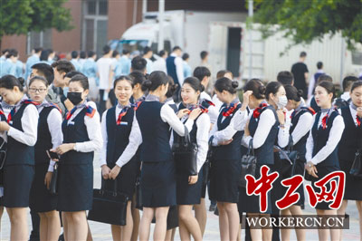 5月7日早晨,四川成都,唐婷婷和同学们列队上空乘专业的早课。10年前的5·12汶川大地震发生后,失去父亲、母亲又重伤,她被送到安康家园。如今,唐婷婷已成长为一名大学生,她希望毕业后能当空姐。