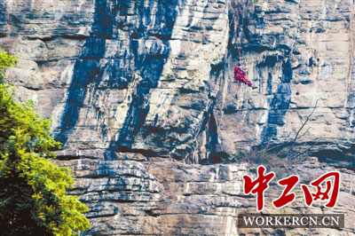 4月13日,四川省叙永县落卜村,东方物探新兴物探开发处2149队的王显压在悬崖上布线。为了找到适合开采的页岩气,他们每天要背着20多公斤重的电缆线在乌蒙山崎岖的山路上步行20多公里。