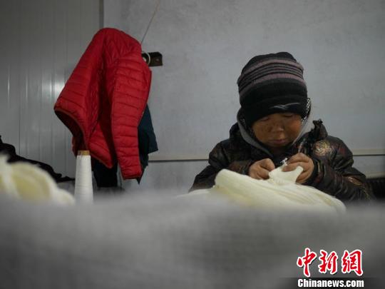 贫困户韩明珠认真对衣物进行整理,这是她每天的工作。 苍雁 摄