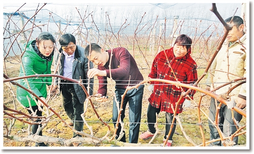 张耀(左三)在葡萄园向种植户传授葡萄冬剪技术。 乔连军摄