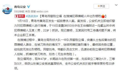 中新网1月20日电 据青岛市公安局官方微博消息,青岛市黄岛区18日发生一起故意杀人案,黄岛分局刑侦大队一中队民警别立福,在搜捕犯罪嫌疑人过程中壮烈牺牲。