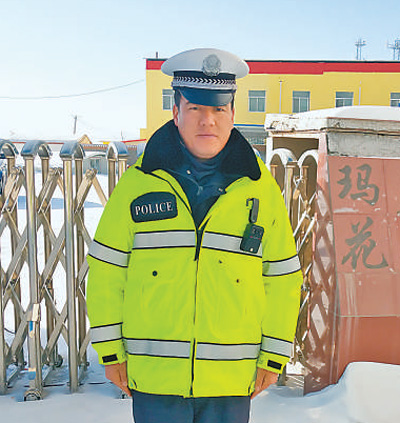 孙建忠所在的交警中队有5个人,负责368公里交通线的安全通行。他用不太流利的安多藏语叮嘱司机注意安全,站上3分钟,口罩上就结了一层冰碴。他不时拍拍身上的雪,尽量让警服显得干净整齐。