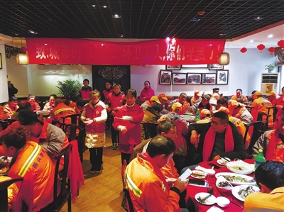 边城雨报道 “各位师傅,大家辛苦了,今年请大家吃个便饭,在此向大家表示衷心感谢!大家放开肚皮吃,菜和酒水、饮料管够!”1月28日中午11时,在余姚文山路“灶福人间”酒店,店老板举起酒杯,向60多名身着橘黄色衣服的环卫工人提前恭贺新春。