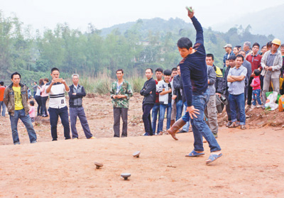 那良镇“三月三”陀螺争霸赛上,参赛选手在打陀螺。资料图片