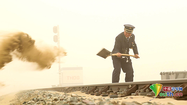 风起沙扬,付泽民清理被沙子掩埋的铁轨,保障列车通行安全。通讯员袁斌 摄