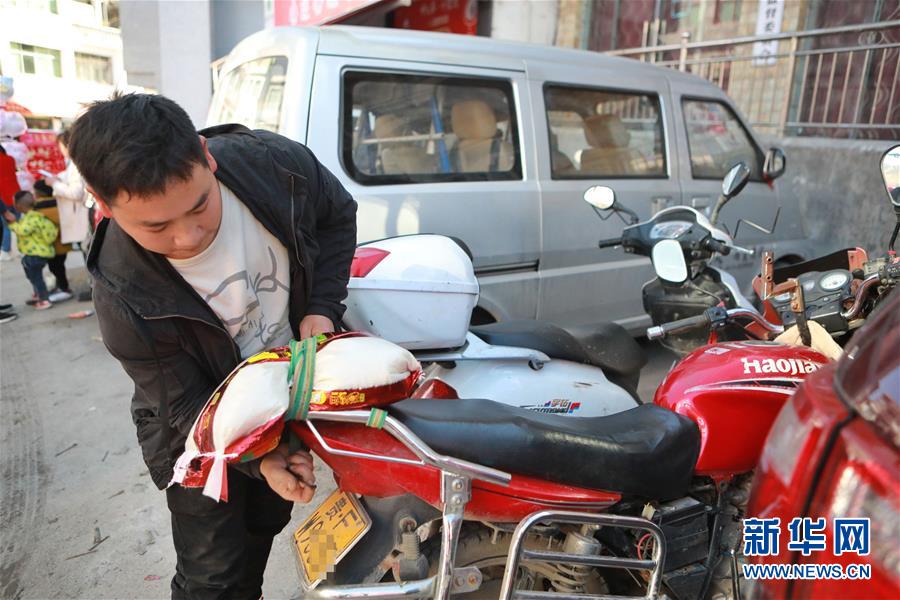 2月6日,赵继才把在超市购买的大米固定在摩托车上。 新华社记者 欧东衢 摄