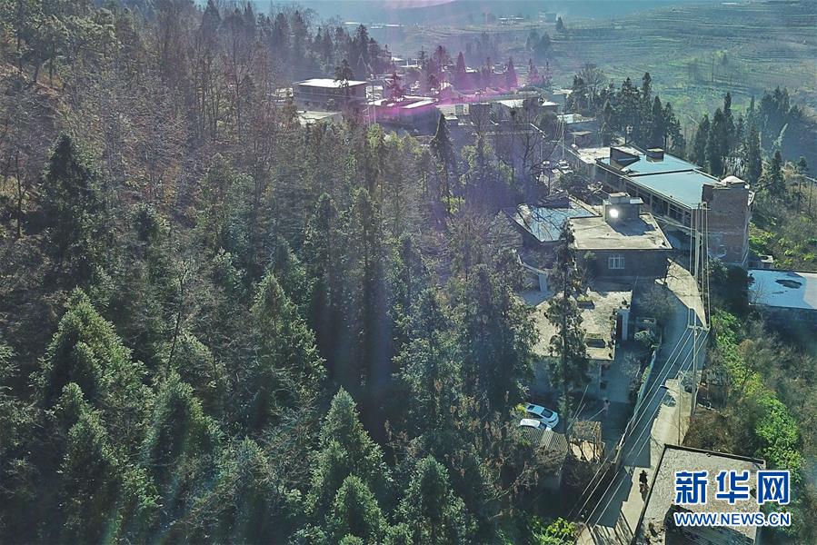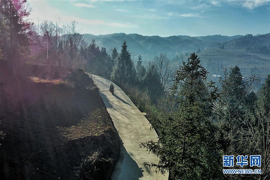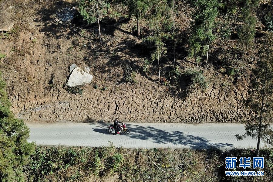 2月6日,赵继才骑行在刚完工的通组公路上(无人机拍摄)。 新华社记者 欧东衢 摄