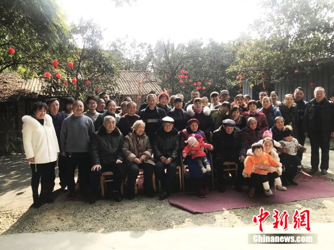 照相机镜头里,118岁老人朱郑氏怀抱着11个月大的第六代孙站在挂满红灯笼的树下,身旁簇拥着数十位后代,灿烂的笑容绽放在她满是皱纹的脸上。