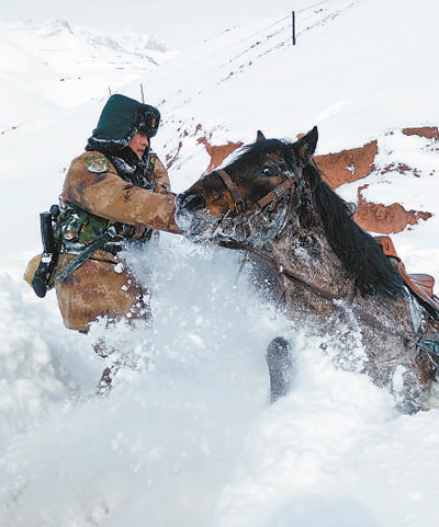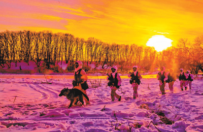 出发不到半小时,呼出的热气便在防寒面罩上结成一层厚厚的白霜,眉毛胡子也挂起了冰溜子,不一会儿工夫,巡逻官兵个个变成了“雪人”,中士吴宁乐观地说:“在祖国边防线上收到这样的‘新年礼物’,我喜欢,我自豪!”