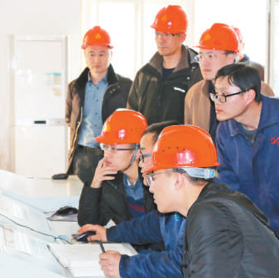 徐锡惠(前排左一)在查阅电厂治污设施中控系统。