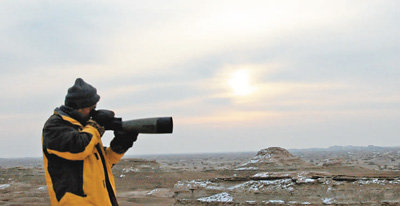 太阳升起时,李鹏飞便早早出发巡检,站在楼兰古墓群的制高点,巡视古墓周边有无异常。
