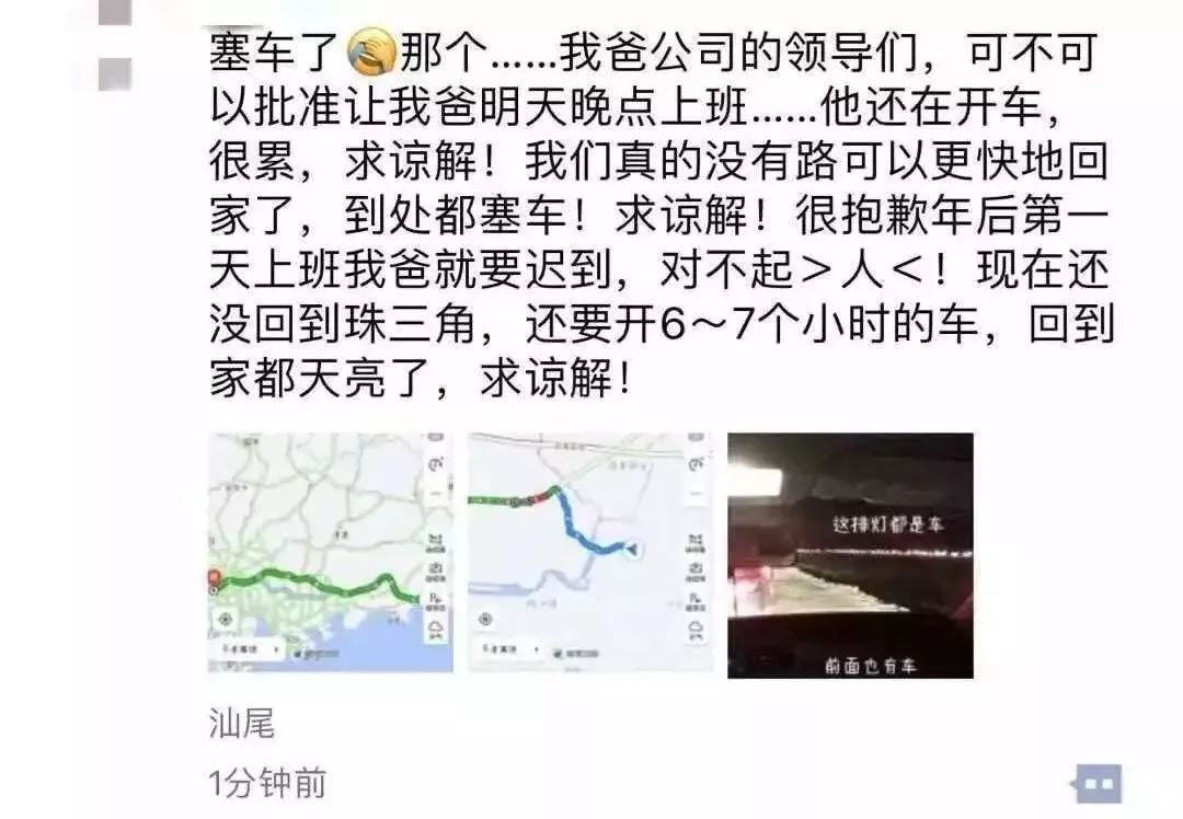 塞车了,那个…我爸公司的领导们,可不可以批准我爸明天晚点上班,他还在开车,很累,求谅解!我们真的没有路可以更快地回家了,到处都塞车!求谅解!很抱歉年后第一天上班我爸就要迟到,对不起!现在还没回到珠三角,还要开6-7小时的车,回到家都天亮了,求谅解!