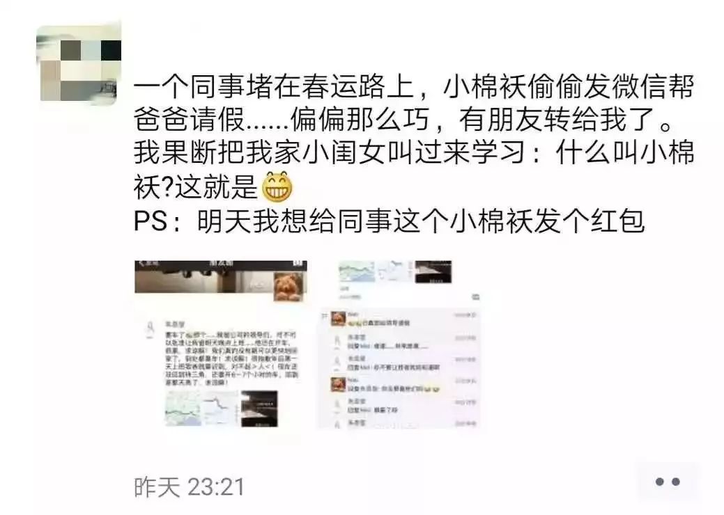 一个同事堵在春运路上,小棉袄偷偷发微信帮爸爸请假……偏偏那么巧,有朋友转给我了。我果断把我家小闺女叫过来学习:什么叫小棉袄?这就是。