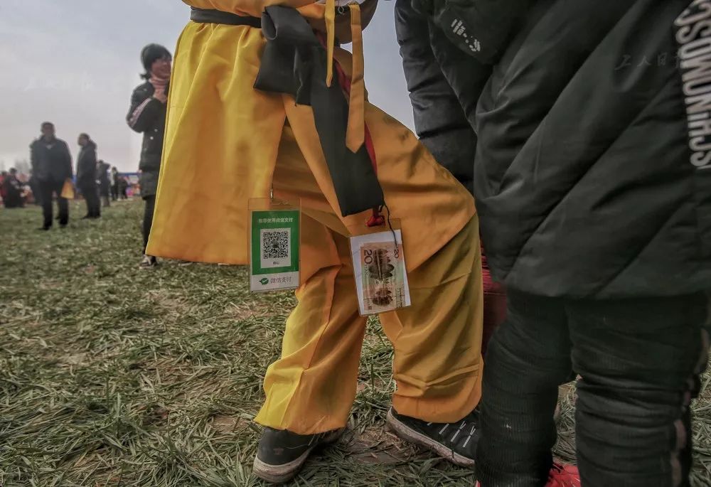 ↑一位孙悟空的装扮者借机与人合影,每次收费20元,可进行微信支付。