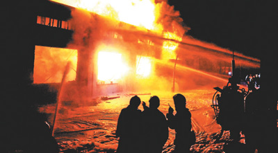 14时55分,和消防员们到达现场。10余位消防员顺着6米拉梯,爬上屋顶,用破拆斧将铁皮屋顶撬起,每掀开一片铁皮,都会涌出一阵滚滚黑烟。记者站在离屋顶大约七八米的消防车上,浓烟夹着灰烬飘进鼻腔和口腔,呛得忍不住咳嗽。