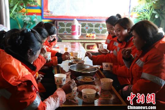 图为近日,阿里地区公路养护段女子护路工人在吃工作餐。 阿旺扎西 摄